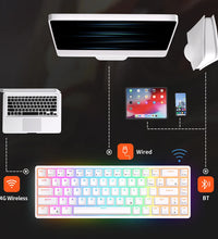 1.THREE MODES- RGB three-mode wireless keyboards on the market. Wireless mode with stable bluetooth 5.0, hassle-free 2.4Ghz dongle plus USB-C wired mode set no limits about your keyboard connection.