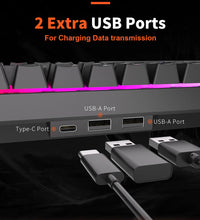 7.Hub Design - This wireless mechanical keyboard is armed with 2 built-in USB pass-through ports and 1 Type-C Portallowing to back up more facilities